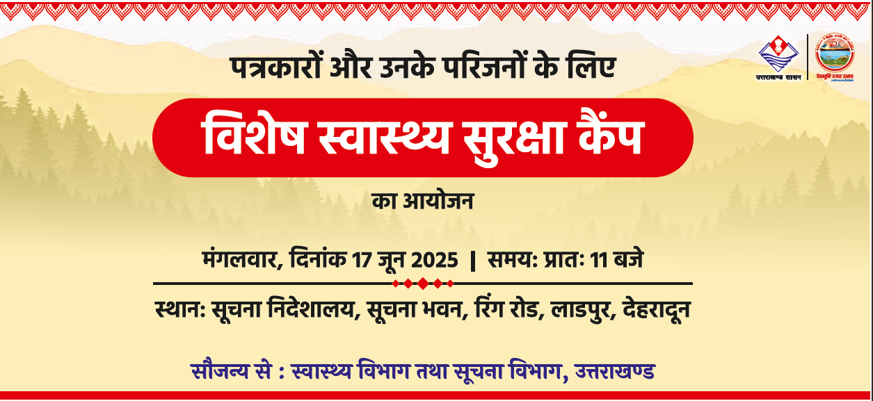 मुख्यमंत्री पुष्कर सिंह धामी के निर्देश के क्रम में मंगलवार 17 जून को स्वास्थ्य और सूचना विभाग की ओर से पत्रकारों और उनके परिजनों की नि:शुल्क स्वास्थ्य जांच के लिए, विशेष स्वास्थ्य सुरक्षा कैम्प का आयोजन किया जा रहा है। इसमें राजकीय दून मेडिकल कॉलेज के वरिष्ठ चिकित्सकों द्वारा जांच के साथ ही परामर्श भी प्रदान किया जाएगा।