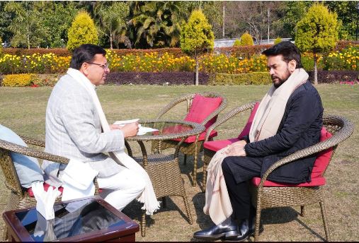 मुख्यमंत्री श्री पुष्कर सिंह धामी से सोमवार को मुख्यमंत्री आवास में सांसद एवं पूर्व केंद्रीय मंत्री श्री अनुराग सिंह ठाकुर ने शिष्टाचार भेंट की।